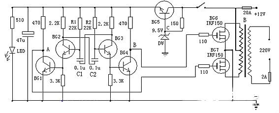 這是一款非常容易制作的逆變器,可以將12V電源電壓變?yōu)?20V市電,電路由BG2和BG3組成的多諧振蕩器推動,再通過BG1和BG2驅(qū)動,來控制BG6和BG7工作。