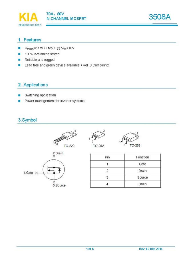 參數: ID(A): 70 BVDSS(V): 80 RDS(ON): 0.011 Qg(nC): 60 Package: TO-252、TO-263、TO-220