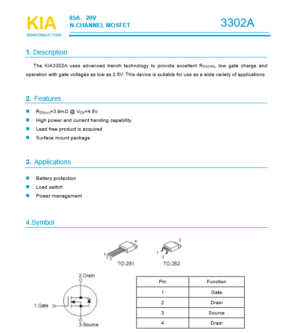 參數(shù): ID(A): 85    BVDSS(V): 20    RDS(ON): 0.0039    Qg(nC): 49    Package: TO-252
