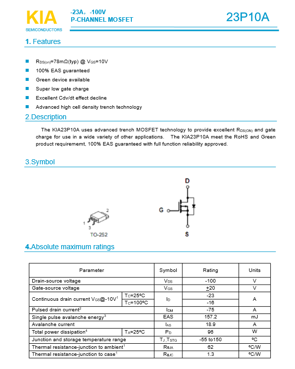參數: ID(A): -23    BVDSS(V): -100    RDS(ON): 0.078    Qg(nC): 44.5    Package: TO-252