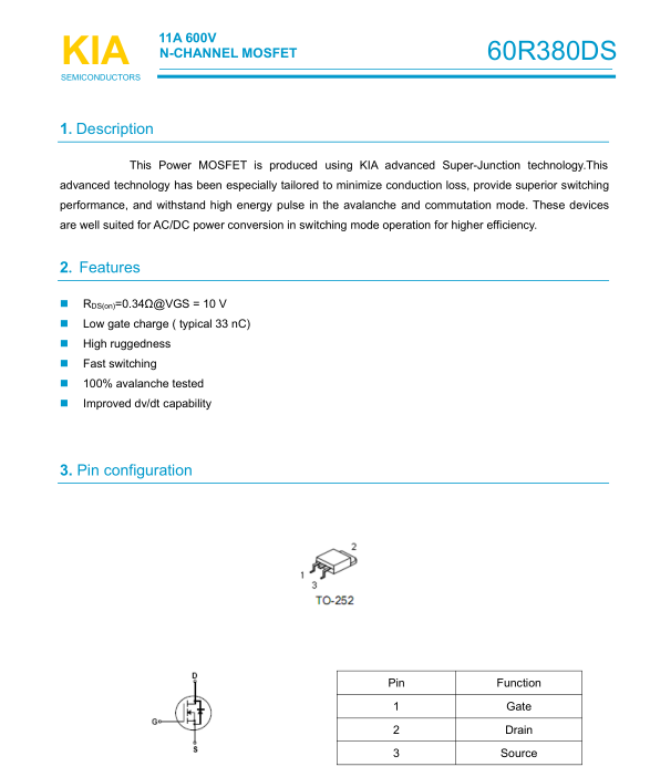參數(shù): ID(A): 11    BVDSS(V): 600    RDS(ON): 0.34    Qg(nC): 33    Package: TO-252