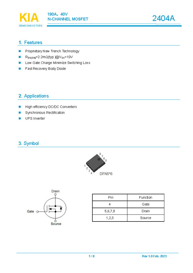 參數(shù): ID(A): 190    BVDSS(V): 40    RDS(ON): 2.2    Qg(nC): 94    Package: DFN5*6
