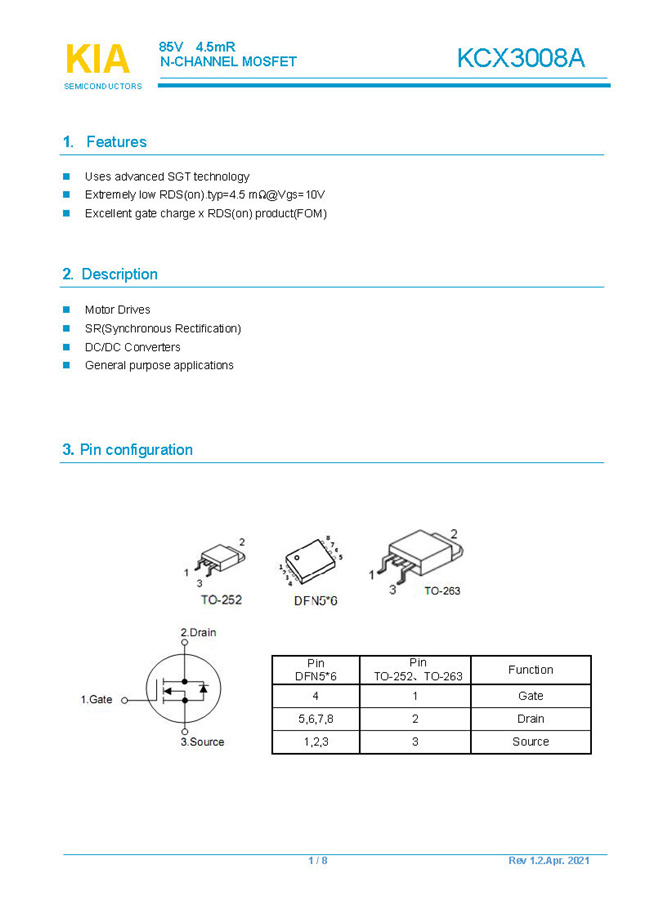 參數(shù): ID(A): 120 BVDSS(V): 85 RDS(ON): 4.5mΩ Qg(nC): 65 Package: TO-252.TO-263.DFN5*6