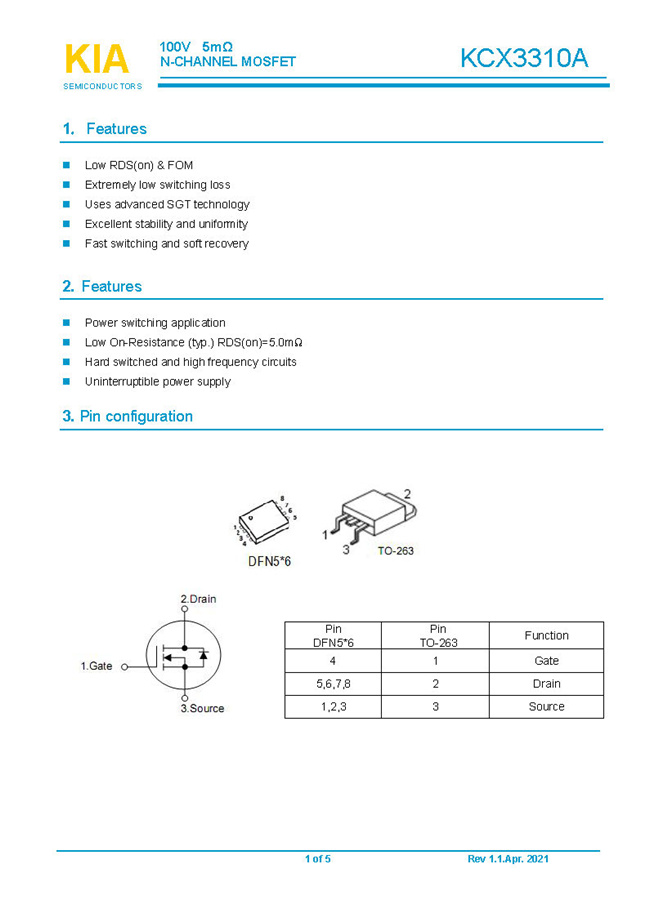 參數: ID(A): 90/85    BVDSS(V): 100    RDS(ON): 5mΩ    Qg(nC): 66    Package: DFN5*6 TO-263