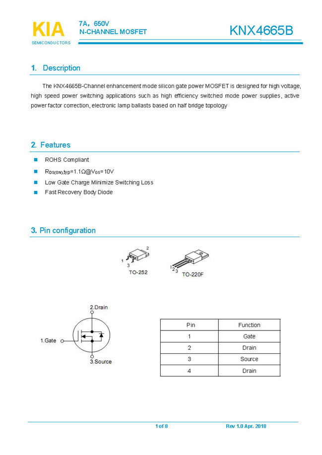 參數: ID(A): 7 BVDSS(V): 650 RDS(ON): 1.1Ω Qg(nC): 24 Package: TO-220F.TO-252