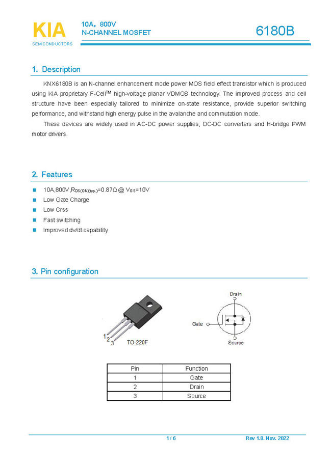 參數: ID(A): 10 BVDSS(V): 800 RDS(ON): 0.87Ω Qg(nC): 32 Package: TO-220F