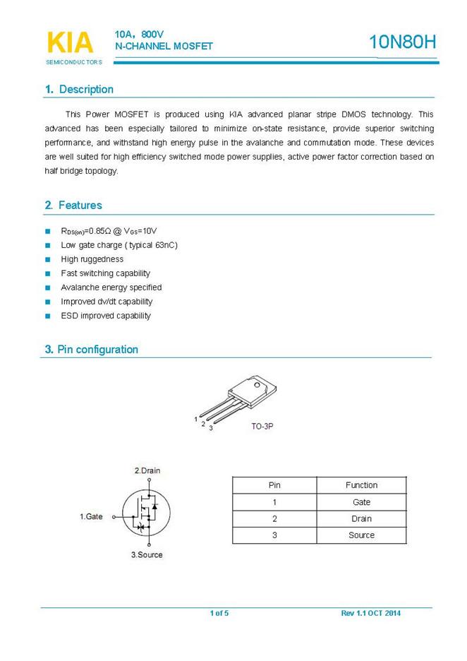 參數: ID(A): 10 BVDSS(V): 800 RDS(ON): 1.1 Qg(nC): 63 Package: TO-3P TO-220F
