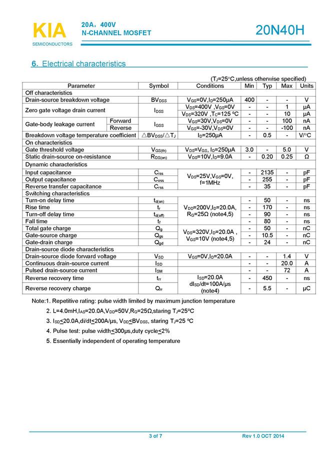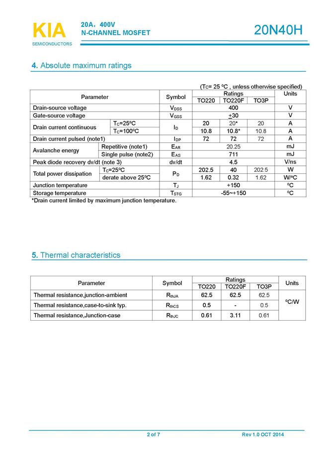 參數: ID(A): 20    BVDSS(V): 400    RDS(ON): 0.25    Qg(nC): 50    Package: TO-220、TO-220F、TO-3P